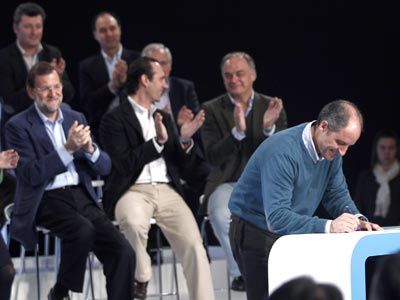 Un Francisco Camps sonriente firma el manifiesto contra la corrupción del PP, en presencia de los corifeos (el candidato Rajoy incluido) que aplauden. Una imagen auténticamente pornográfica. Una pantomima de la democracia. El presidente de la Comunidad valenciana, imputado por cohecho, se compromete así a actuar “ante cualquier supuesto de denuncia o de incoación de procedimientos judiciales». Denuncia, instrucción judicial, pruebas, penden de su cabeza, mientras… sonríe.