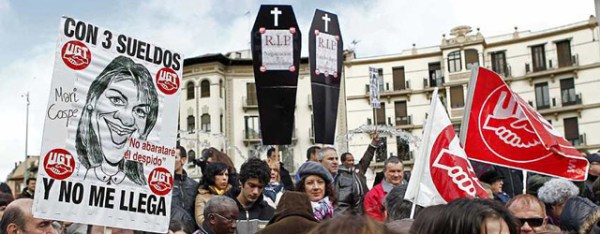 Se estudia si su decreto ley incumple 8 preceptos constitucionales… cuya resolución se extendería no menos de 5 años. Ya hay ejemplos de su aplicación: un taller de coches de Gijón propone aumentar 5 horas la jornada y reducir salarios en un 15%. O estos otros, víctimas de la barra libre del despido. Así, dice Rajoy, nos ponemos «a nivel europeo». No es cierto, pero sería en el despido en todo caso, no en los sueldos que duplican y triplican los nuestros y permiten afrontar cualquier eventualidad. Tampoco en las prestaciones sociales que se sitúan para los españoles entre las más bajas de la tabla. Y toda la plana mayor del PP sigue a Cospedal, cuando se quita la mantilla española y el rosario, para decir: ha sido la «herencia«.