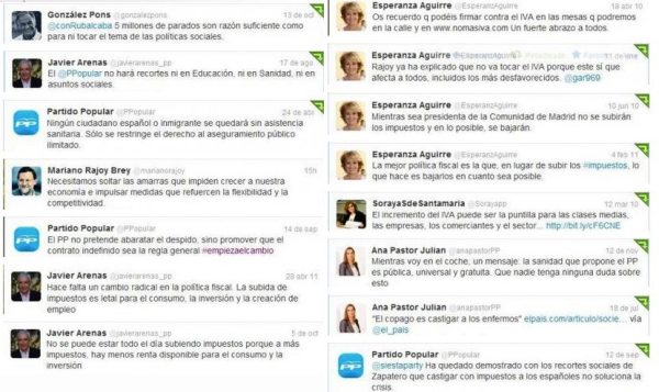 Pero la vida oficial camina por otro lado. El PP aprovechando su mayoría absoluta para una involución ideológica a todos los niveles que debería al menos pensar en el 70% del censo electoral que no le ha votado. Y empecinado en mentir con un desparpajo que asombra. Un usuario de twitter, @lospajarospican, ha recopilado viejas perlas que al confrontarlas con la verdad de hoy abochornan (a quien tenga vengüenza, naturalmente, incluso ajena).