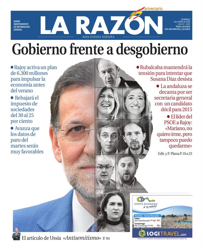 Ésta es la portada del domingo 1 de Junio. Podría firmarla The New York Times ¿a que sí? El director de La Razón, en los ratos libres que le deja su permanente presencia en las tertulias de televisión, la acompaña de un editorial en el que asegura: El bipartidismo se rompe por la izquierda. Y en él concluye alertando de los graves peligros que nos atenazan por la debacle del PSOE, él y solo él (nada que ver con la abultada pérdida de votos del PP) es el culpable: