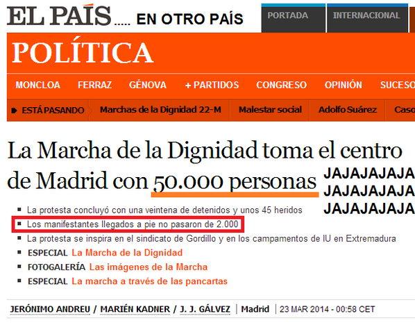 Estaban allí los más perceptibles: en y como un montículo con visión privilegiada. Los periodistas fueron testigos de las casi cuatro horas de Marchas por la Dignidad que confluían en Madrid. Los grandes medios internacionales han hablado profusamente de su magnitud –hasta dos millones de personas dan de cifra-, de sus motivaciones, de cómo se desarrolló todo. Aquí, tras la oportuna intervención de la policía –a tiempo para entrar en los telediarios, en todos-, se han destacado… los incidentes. A este nivel, por ejemplo: