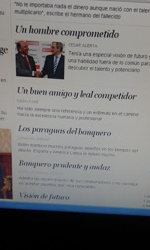 “Habituada a recordar a los prescindibles, a los desechados por estas gentes, ignoro en qué consiste la loa a esos hombres que supieron construir un imperio y llevar el nombre de España más allá de nuestras fronteras –Suiza, por ejemplo– y que, no contentos con ello, siempre echaron una mano a los medios de comunicación endeudados, a los exmandatarios que iban por ahí dándose cabezazos como topos, en busca de una puerta giratoria, a ese hoy doliente don Isidoro de El Corte Inglés, al que compró nuestras tarjetas de compra a crédito para que no se viera en la miseria. Un hombre, don Botín, al que no le dolían prendas para arrancar el indulto de Alfredo Sáez. En fin, tantas obras y tanto bien, un mecenazgo el suyo de tal altura, que una no se siente a la ídem, ni puede imaginarse pergeñándole una necro en condiciones.