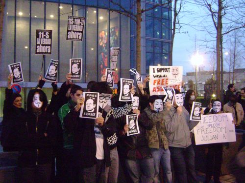 La concentración contra la detención de Assange me resultó, el otro día, igualmente demoledora. O más. Caretas –bebidas en la cultura audiovisual, me explican- para jugar a protestar. En el debate de El País del martes, otro joven –menos que todos estos- me abordó, sin presentarse, para decirme que no espere gente en la calle (que no la espero, lo he dicho muchas veces, hay que buscar otras formas), “la batalla se da en Internet”, dijo, «¿a golpe de clic?»y, él respondió ofendido: esto termina por llevar, con la amplificación del mensaje, a acciones como las de los hackers. En ese debate sí había jóvenes, eran mayoría de hecho. Desorientados y rabiosos algunos de los que hablaron.