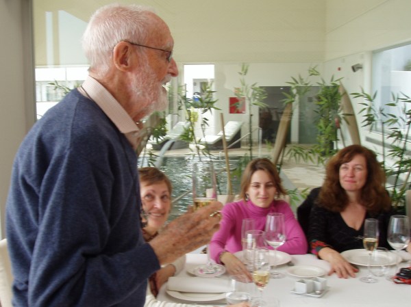 Sampedro brinda en su 94 cumpleaños. Al fondo Olga, Amaya Delgado y Lola Larumbe. Restaurante Avanto, Mijas Costa (Málaga)