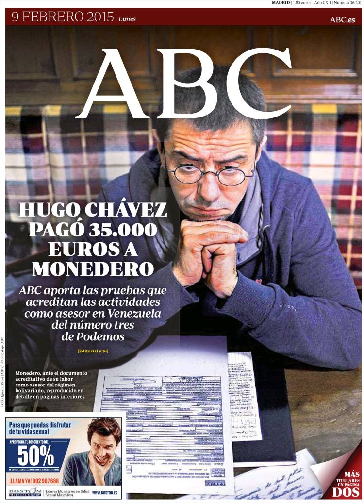 Siguen empecinados con esas portadas que acusan a Monedero de cobrar 35.000 euros de Venezuela o similares, cuando no se emplean en contar el material antidisturbios que el Gobierno español vende a “los bolivarianos” para que sacudan a la disidencia, en los que se incluye hasta cianuro. Informando se apartarían del objetivo: la maquinaria trata –con cierto éxito, al parecer– de afianzar la creencia de que todos son tan ladrones como ellos y no hay nada mejor que seguir como estamos.