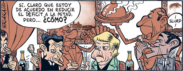 En España entretanto vemos a Zapatero entusiasmado con la nueva religión del “mercado”, no más incremento del gasto público, del gasto social. Y a Rajoy que, en lo poco que dice de su “programa” económico, se muestra no partidario de la tasa bancaria. ¿Un visionario? ¿Un rebelde emergente? No, el mayor y más desvariado colaborador del “sistema” neoliberal… más aún que el renovado Zapatero, que ya es decir. Al menos, al presidente le gustaría, dice, ir a un impuesto bancario.