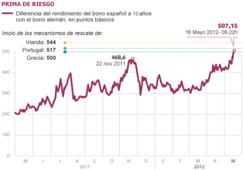La prima de riesgo española ha rebasado los 500 puntos, ha llegado incluso a los 507. Como hablábamos el otro día, a Portugal se le rescató cuando alcanzó los 533, a Grecia a los 566 puntos y a Irlanda a 569, si bien los mecanismos se desataron antes aún, con menor diferencial como muestra el gráfico. La “ayuda” de la UE y del FMI ha consistido en cantidades irrisorias (78.000 millones de euros Portugal, por ejemplo) frente a lo entregado a los bancos: 1,6 billones de euros. Los ciudadanos de los países con problemas han pagado en sangre su rescate y han visto también desaparecer su patrimonio público por las privatizaciones. A los bancos no se les ha exigido contrapartida alguna. Por el contrario se les sigue facilitando dinero en créditos al 1%.