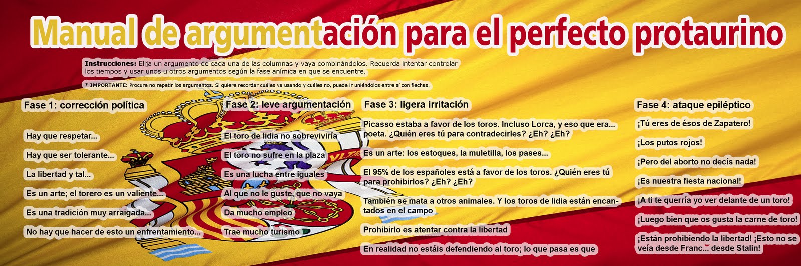 Siento una profunda envidia de Cataluña. Allí es posible que el Parlamento debata leyes promovidas por la iniciativa ciudadana. Y se oyen argumentos a favor y en contra –en lugar de insultos en busca de adeptos-, y los partidos dan libertad de voto a sus diputados. Cierto que seguramente lo consideran un tema menor, pero ver a los políticos evadirse de la férrea disciplina de partido y utilizar su propio criterio me parece un avance. Un ejemplo a seguir. En Madrid, la “fiesta” ha sido declarada de interés público manu militari. Y aquél que se cantea sin babear al jefe (o a la jefa) –que le colocará o mantendrá en el puesto- termina por dejar su dignidad debajo de la cama.